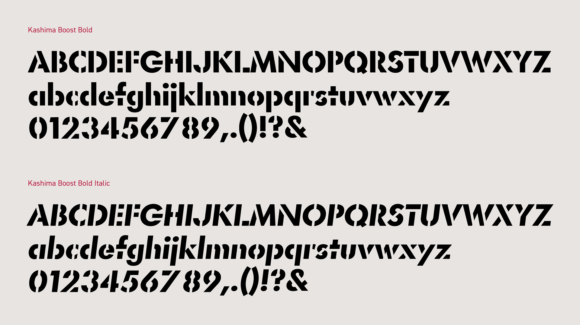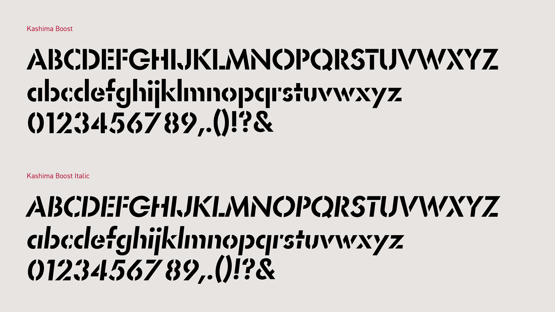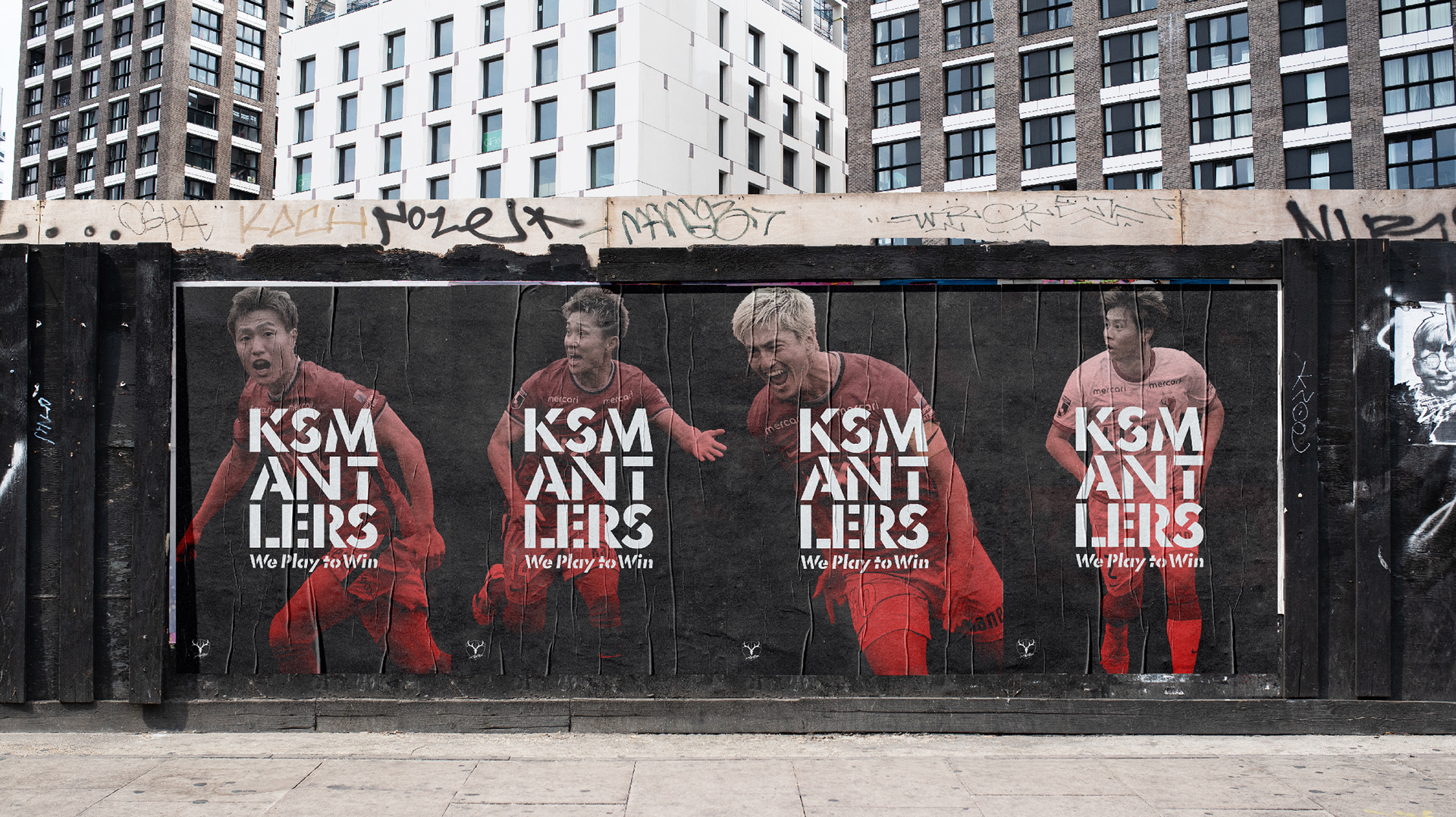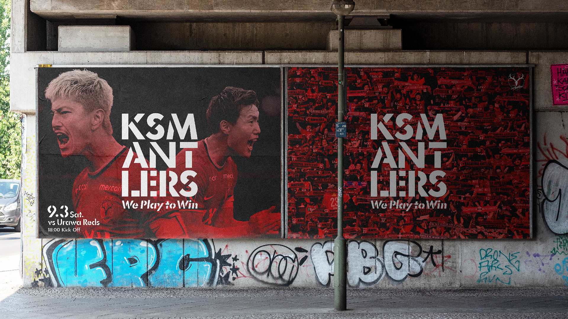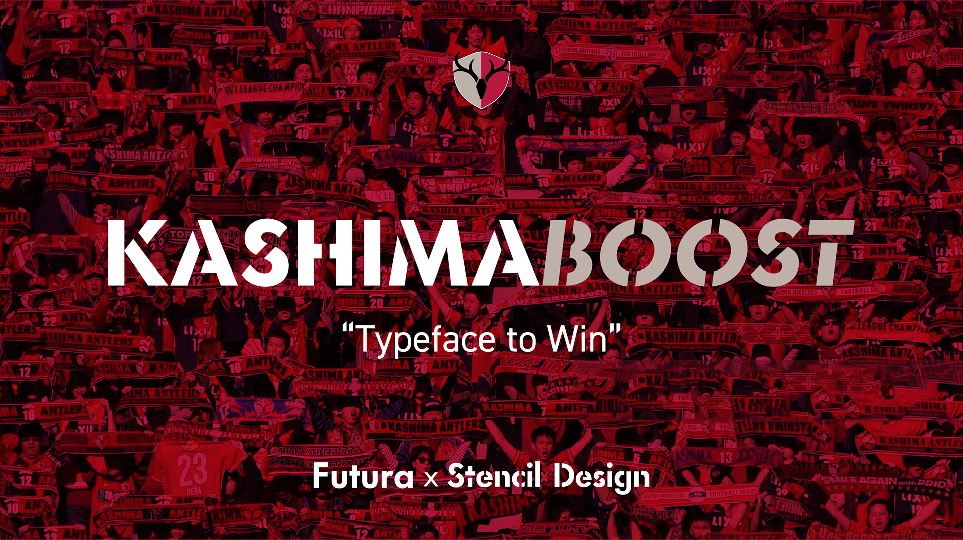 私たちは鹿島アントラーズのためのオリジナルフォント、“Kashima Boost”を制作しました。 このフォントはコンセプトとして“We play to win.”を掲げ、 選手だけでなく全てのサポーターを元気づけるイメージが反映されています。そのため、ステンシルデザインを採用しました。 クリエイティブディレクターの源馬大輔氏の監修のもと、ユニフォームやフラッグ、マーチャンダイジングデザイン、 さらには会場周辺のキービジュアルも一緒に開発し、広範に展開しています。